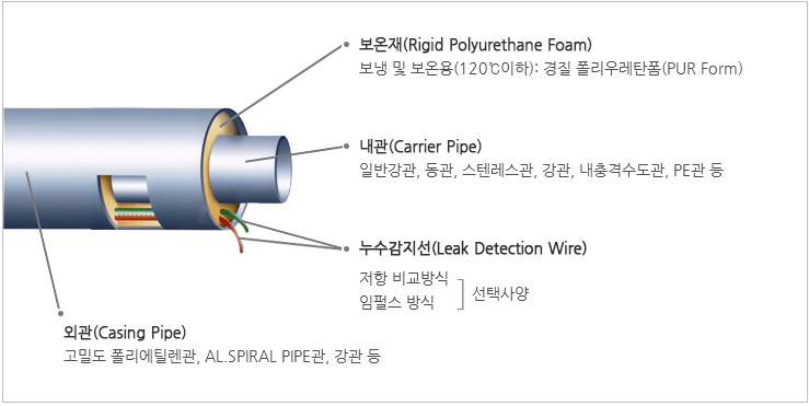 기존 배관 보온(보냉) 작업 시 유리면, 암면, 펄라이트 등의 단열재를 사용하여 외부 Casing작업하는 복잡한 현장보온 배관 방식과는 달리, 단열재 중 보온성이 가장 우수한 경질폴리우레탄폼을 사용하여 Jacket Pipe 포함 공장에서 완벽하게 보온 제작되어진 배관을 말한다.