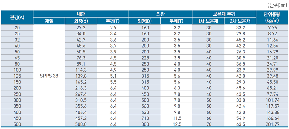 120℃이상의 증기를 이송하는데 사용되는 배관으로 1차 보온재와 2차 보온재를 동시에 적용