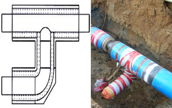 ■ 티(Tee) Tee는 분기관 역할을 하며, 열팽창에 의한 움직임 및 구조 배분에 적합한 설계에 의해 제작되며 아래 그림처럼 응축수를 배출하는 경우에도 사용된다. |