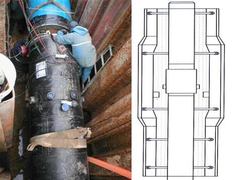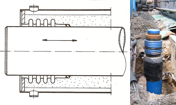 ■ ENDSEAL 내관과 외관의 기밀상태를 유지하는 역할을 하며, Socket이 부착되어 진공처리, 기압시험, vacuum jumping, 안전밸브(Safety valve)등을 부착할 수 있도록 한다. 밀폐가 되면서 내관의 움직임이 가능하도록 설계되어야 한다. 내관의 움직임이 큰 증기배관에 사용한다. |